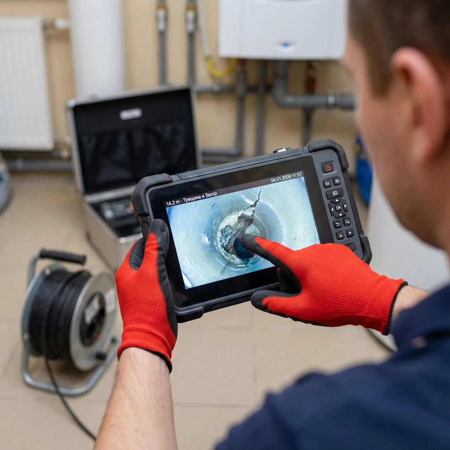 ✅ Мы запускаем её в вашу канализацию. Она проходит по всей длине труб - 5, 10, 30 метров. И показывает на мониторе всё, что происходит внутри. В режиме реального времени.